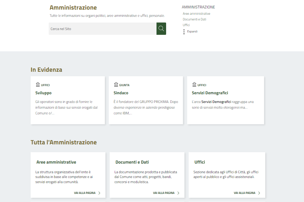 Cliccando sul menĂ¹ "Amministrazione" si accede ad una serie di sezioni che raccontano la vita amministrativa del Comune, da un punto di vista politico, tecnico e burocratico.