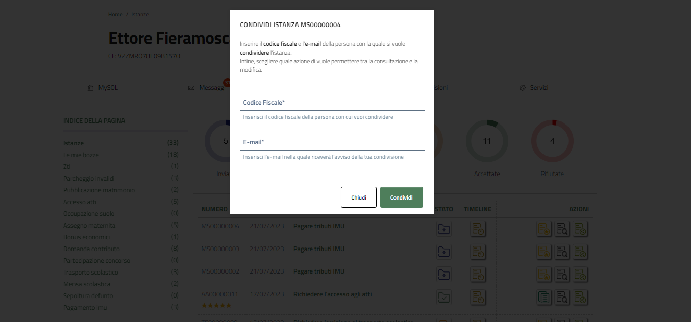 Per avere sempre sotto controllo le istanze presentate è presente un cruscotto personale accessibile, previo login, cliccando sul proprio nome in alto a destra, e selezionando My Sol.