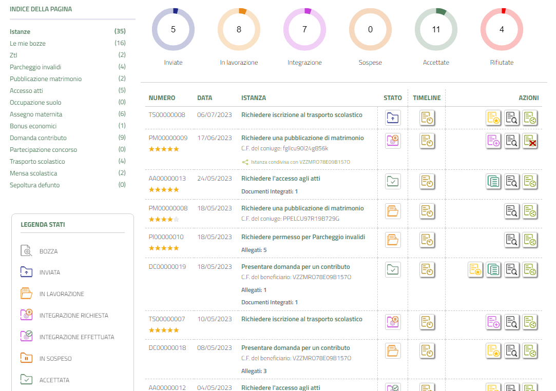 La sezione Istanze mostra in modo analitico ogni singola istanza presentata e il suo stato.