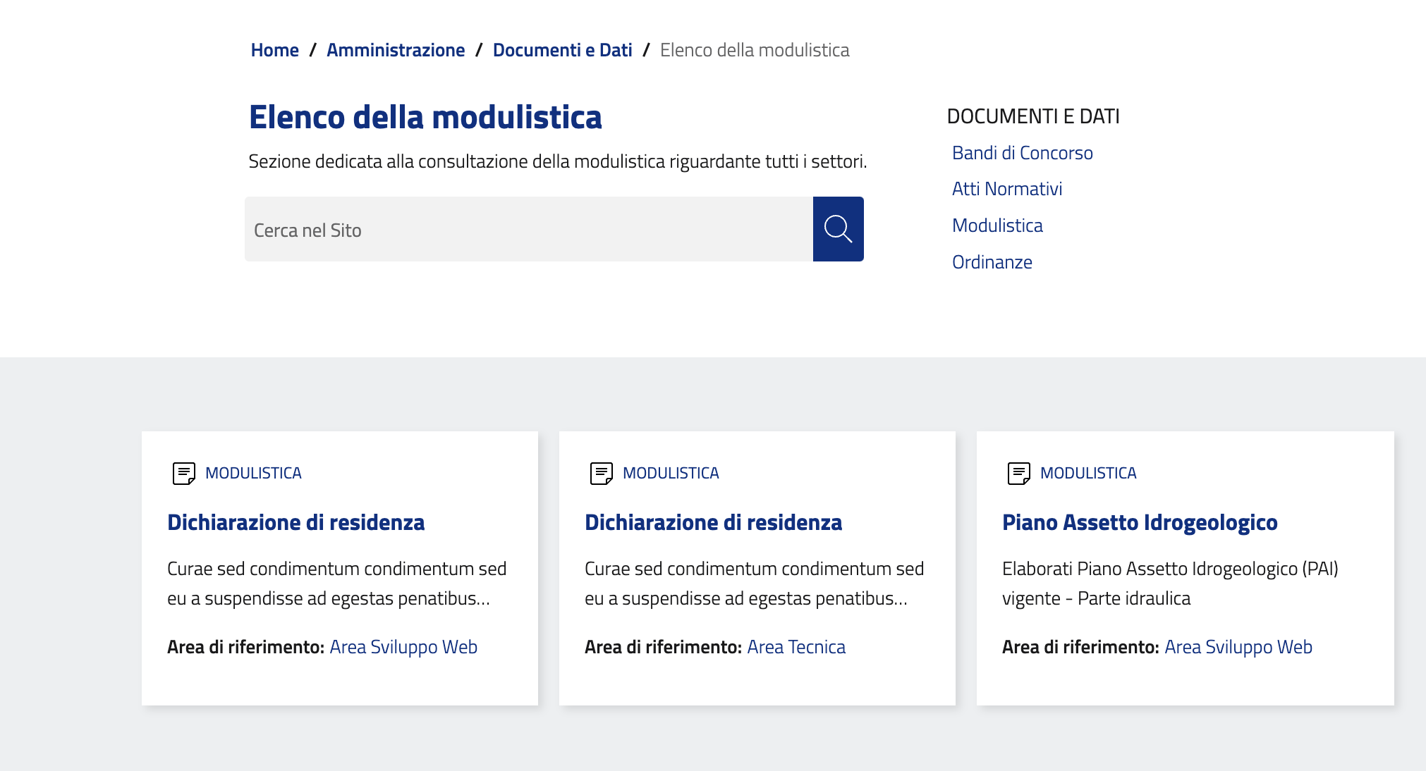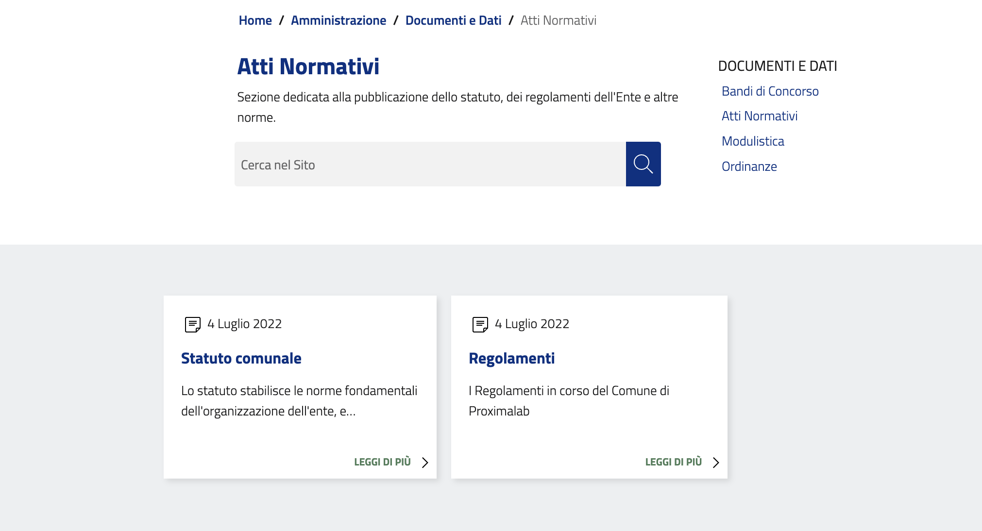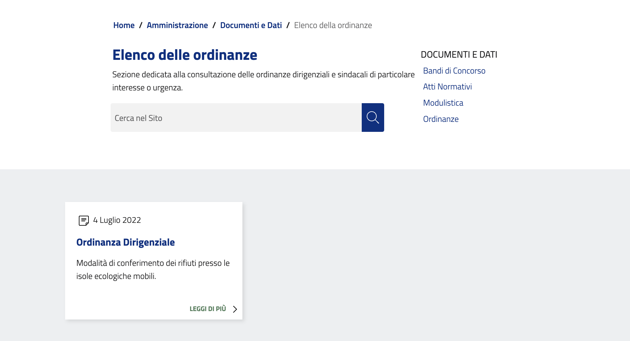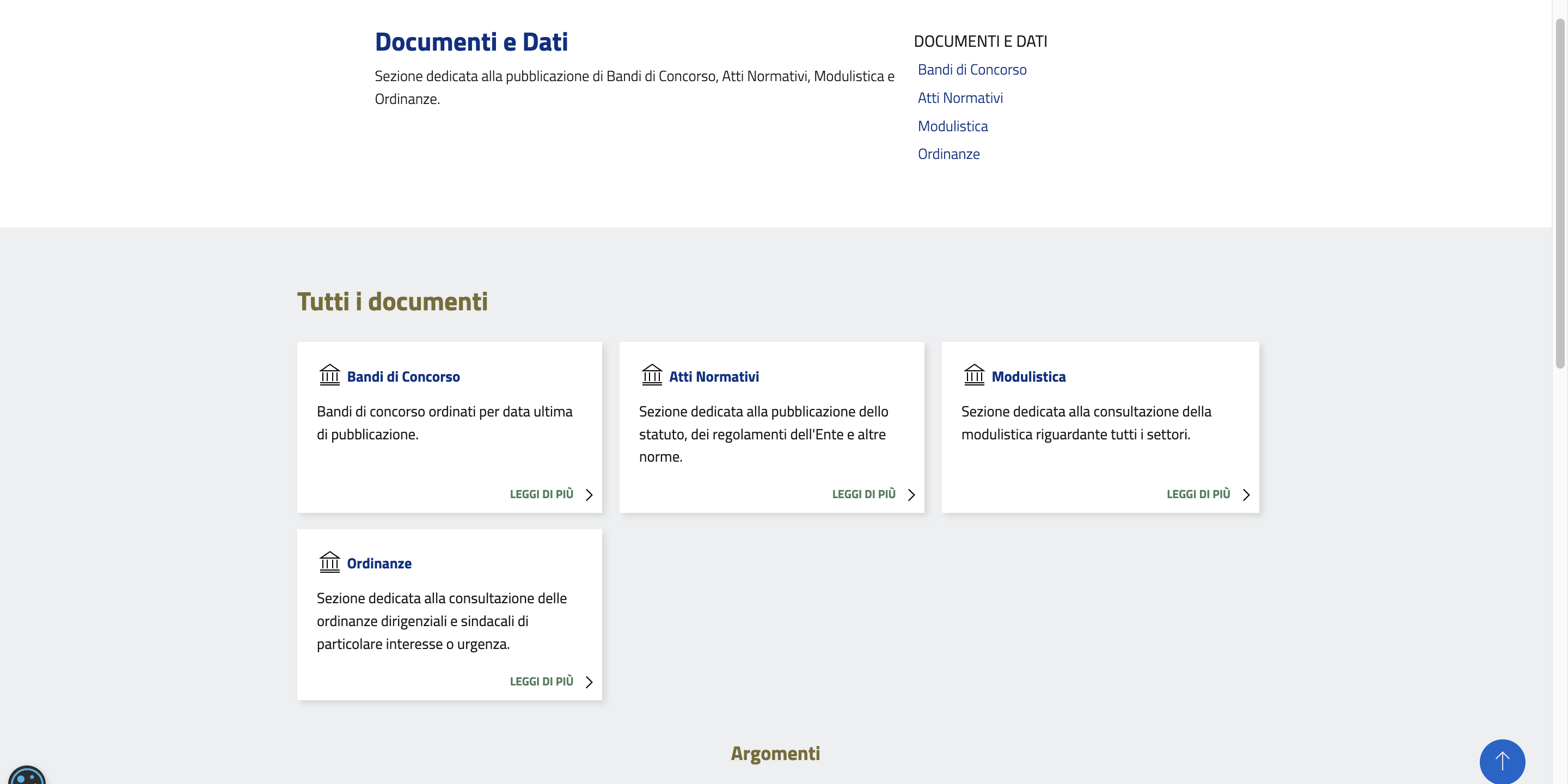 La sezione Documenti e Dati raccoglie con ordine l'accesso ai numerosi documenti del Comune.