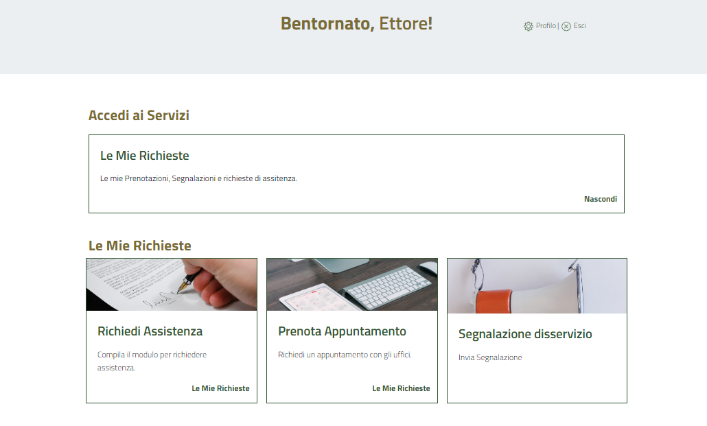 Le mie richieste: cliccando su Le mie Richieste, si possono prenotare appuntamenti, effettuare segnalazioni e richiedere assistenza sul portale oltre a vedere lo storiche delle richieste già presentate.