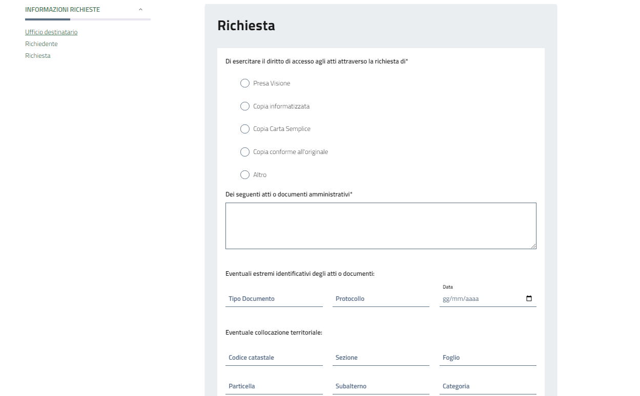 Nel box "Richiesta" vanno inseriti i dati specifici del/dei documento/i richiesto/i.